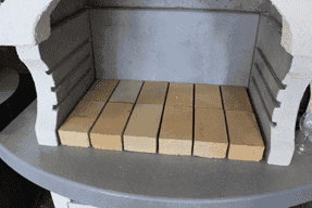7.Выкладывается задний и передний ряды (Фото 12) пода топки из шамотного кирпича. Кирпич выкладывается с технологическим зазором без использования клея. Затем также, без клея, вставляется декоративная стальная пластина (Фото 13).
